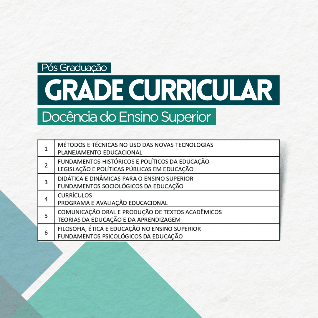 • Aprofundamento em fundamentos da educação, ética docente, legislação educacional e políticas públicas de ensino superior